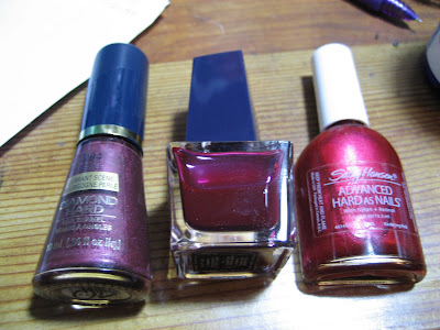 From left to right: Max Factor Diamond Hard Currant Scene, Avon Flammable, & Sally Hansen Advanced Hard as Nails Ravishing Red.